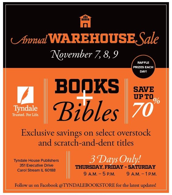 On November 7-9, 2019, Tyndale House Publishers will be holding its third annual warehouse sale. The warehouse sale will include discounts up to 70 percent off on scratched and dented books, Bibles, and many other overstock items!